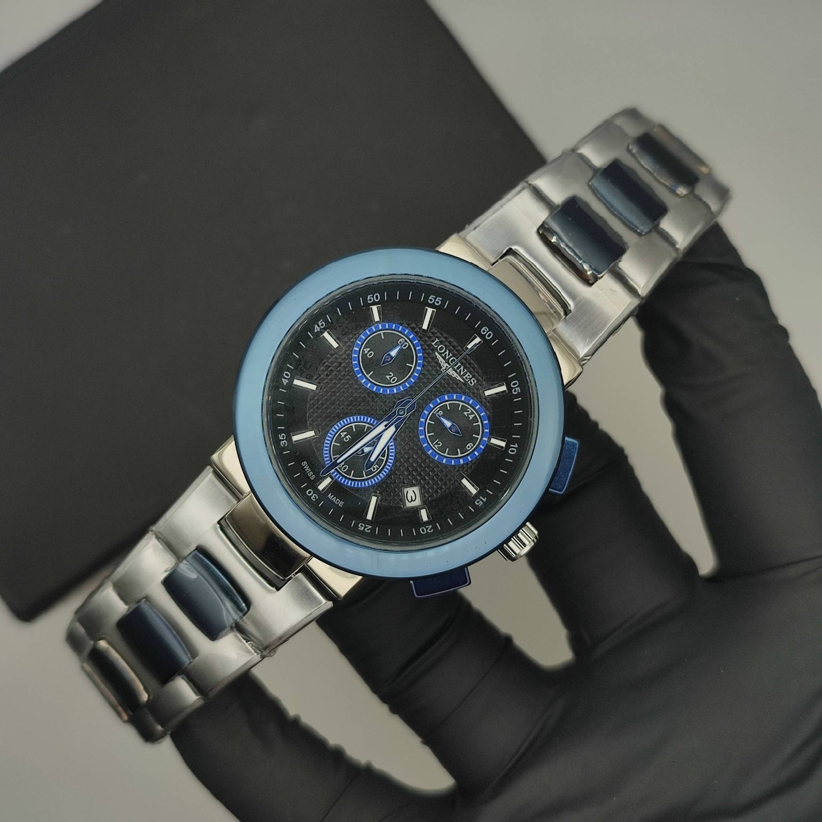Master Grade Chronograph Watch – Silver Blue Chain (Black Dial)